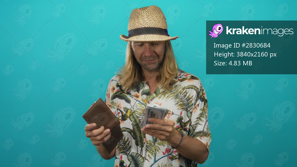 Man wearing straw hat and floral shirt counting a thick stack of crisp us dollar bills against a turquoise background in studio; joy.