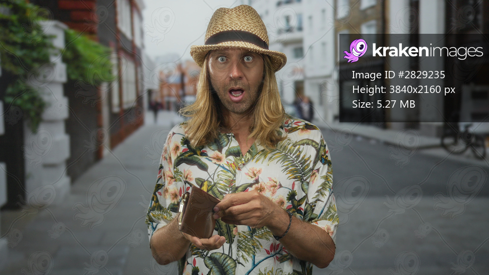 Man wearing straw hat and floral shirt opening a brown leather wallet with both hands on city street; anxiety.