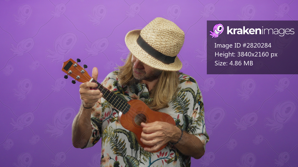 Man wearing straw hat and floral shirt strums ukulele in purple studio; holiday relaxation vacation vibe.
