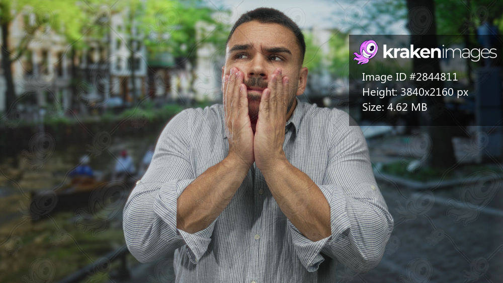 Man wearing striped shirt with hands pressed to cheeks and closed eyes on street by canal; contemplation.