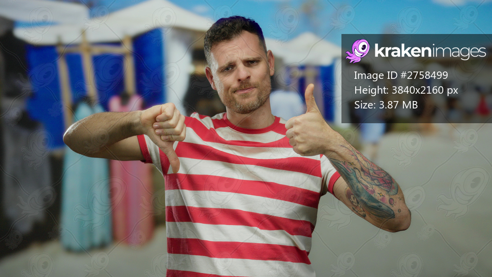Man wearing striped shirt outdoors gives thumbs up and down expressing mixed feelings in urban marketplace setting.