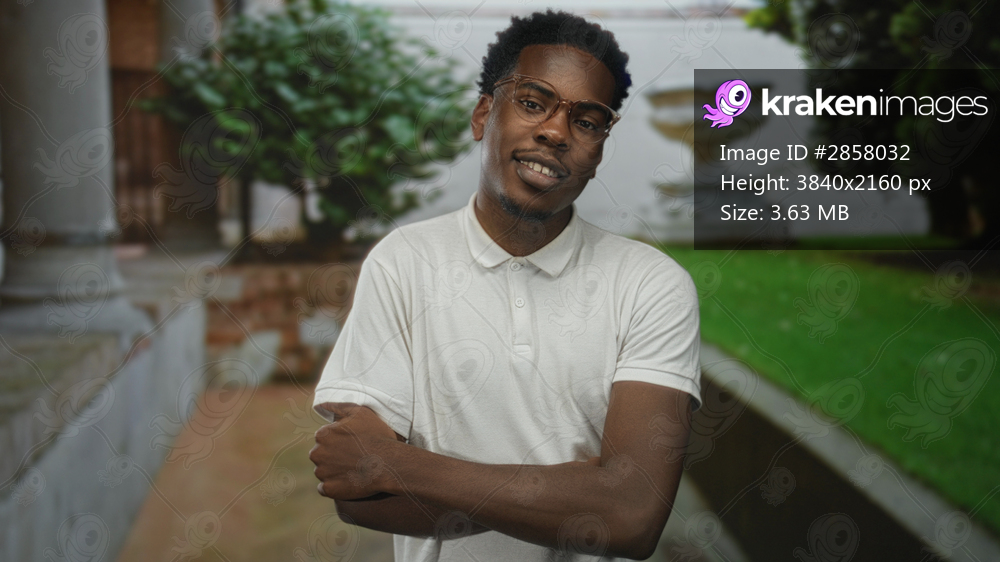 Man wearing sunlit crisp white polo shirt crosses his arms in street by a building under soft morning light; confidence.