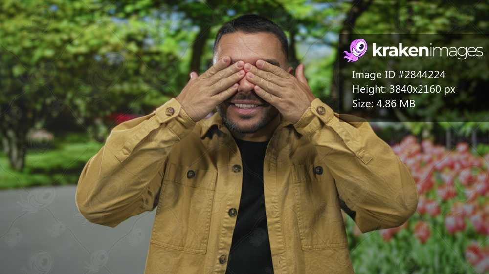 Man wearing tan jacket smiles and covers eyes with both hands in a forest surrounded by green trees; playfulness.