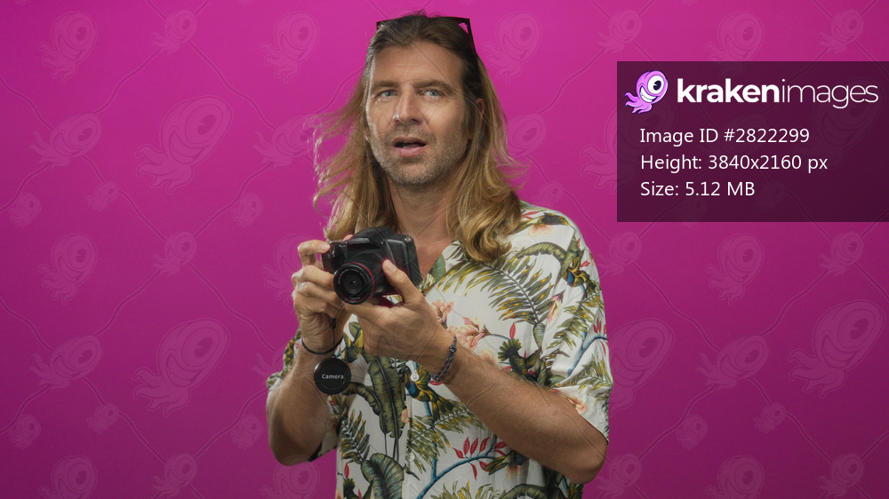 Man wearing tropical shirt holding camera to eye in bright pink studio; creativity exploration curiosity.
