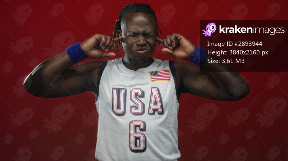 Man wearing usa basketball jersey plugging fingers in ears in studio with red backdrop; frustration determination resilience focus.