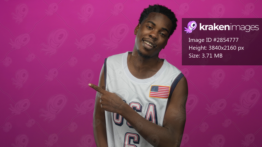 Man wearing usa basketball jersey pointing finger in pink studio; confidence patriotism youth optimism.