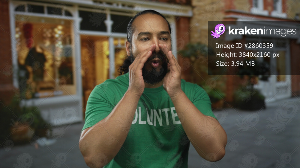 Man wearing volunteer shirt cups hands to mouth shouting on street outside shop building; community outreach urgency.