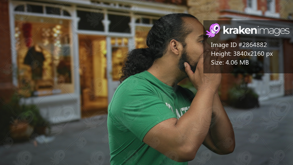 Man wearing volunteer shirt cups hands to mouth shouting on street outside shop building; community outreach urgency.