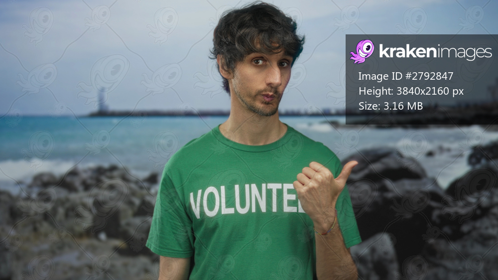 Man wearing volunteer shirt smiles and gives thumbs up amid rocky beach shoreline; optimism support community.