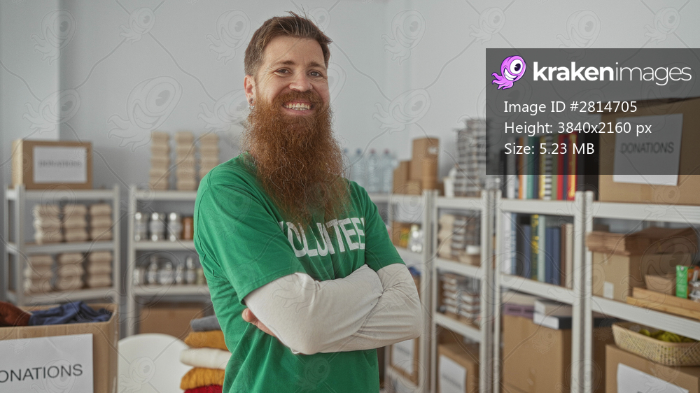 Man wearing volunteer shirt stands with crossed arms next to labeled donations box in building; compassion dedication.