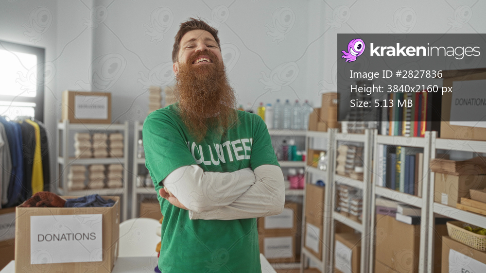 Man wearing volunteer shirt stands with crossed arms next to labeled donations box in building; compassion dedication.