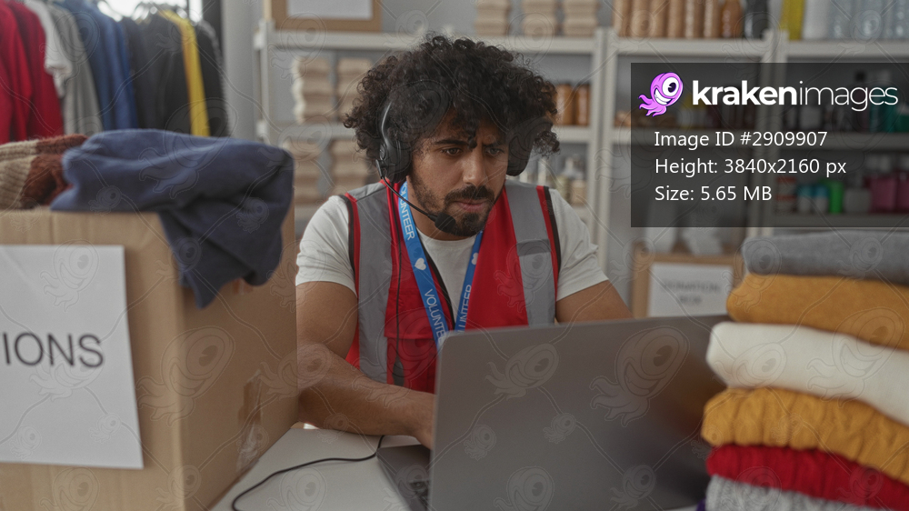 Man wearing volunteer vest and headset types on laptop in donation building; compassion service community.