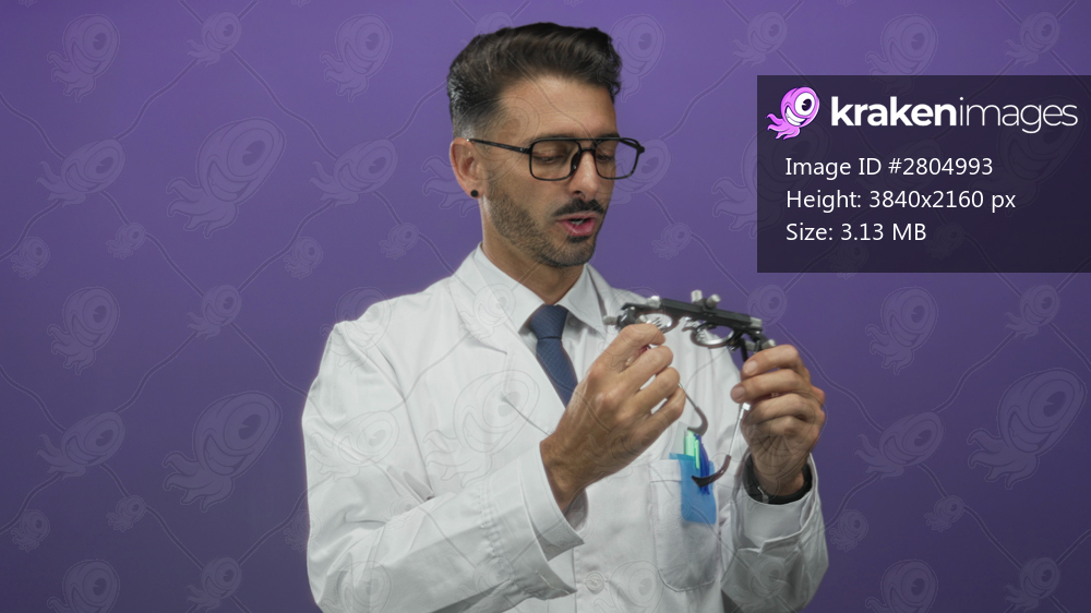 Man wearing white coat holds and adjusts black trial frame eyeglasses tool in purple studio with focused gaze; precision.
