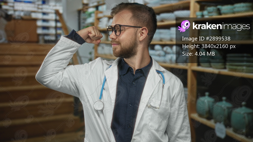 Man wearing white coat with stethoscope flexes arm and smiles in home decor shop; confidence compassion care.