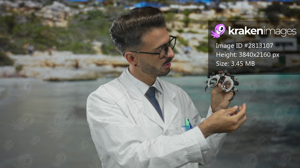 Man wearing white lab coat adjusts metal trial lens frame near seaside building; precision and serenity.