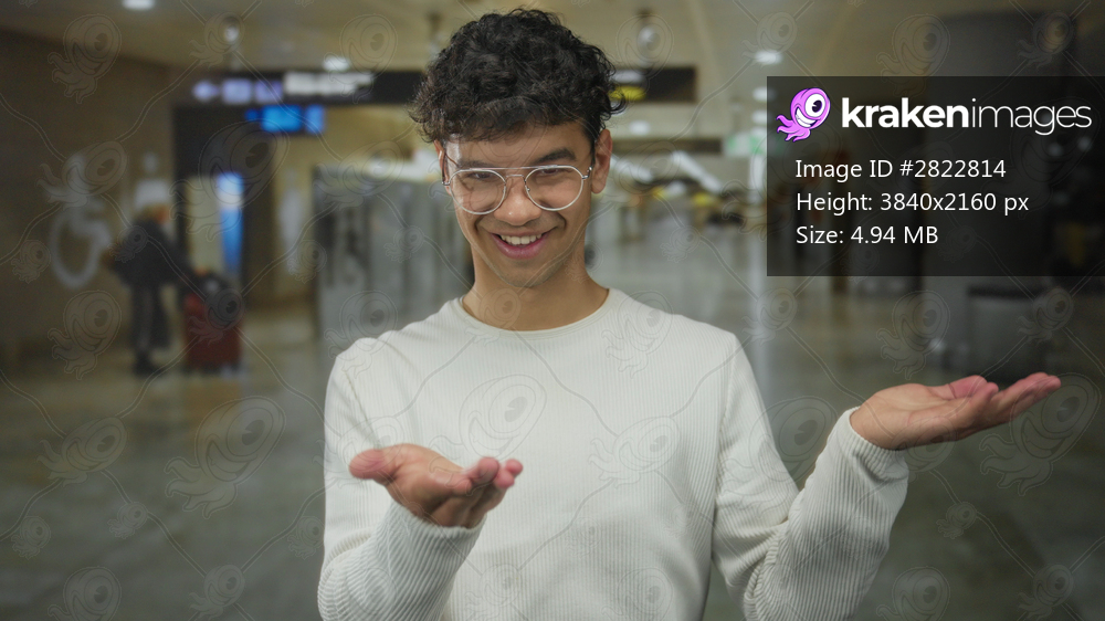 Man wearing white long sleeve shirt and eyeglasses holding open palms in airport terminal indoors; welcoming.