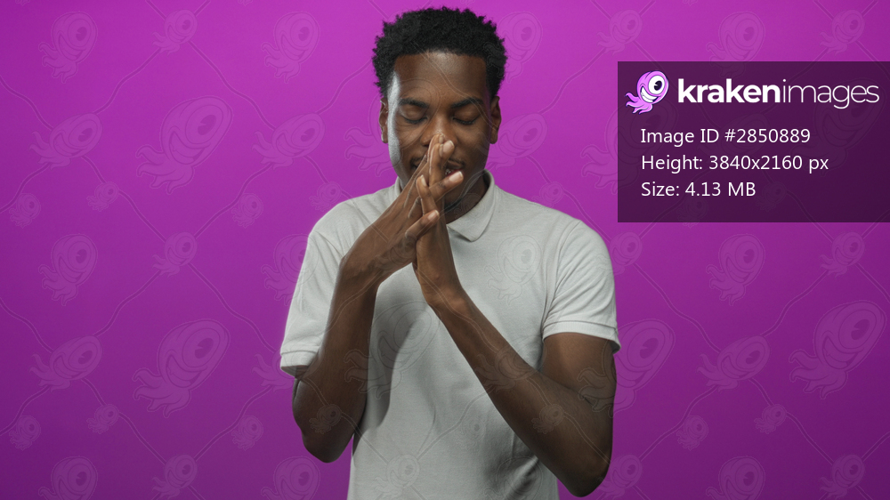Man wearing white polo shirt with clasped hands gesture in purple studio space; calm mindful reflection.