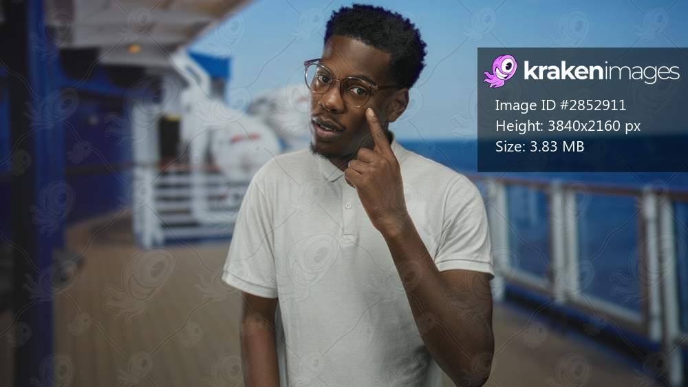 Man wearing white polo shirt and glasses standing on boat deck with arms at sides; quiet reflection.
