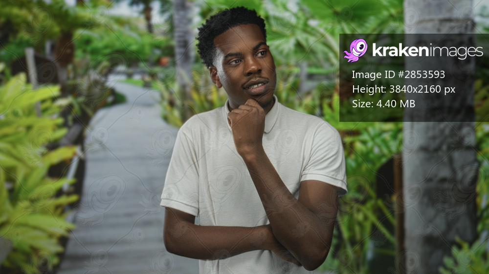 Man wearing white polo shirt touches chin thinking next to wooden walkway in forest surrounded by lush foliage; reflection.