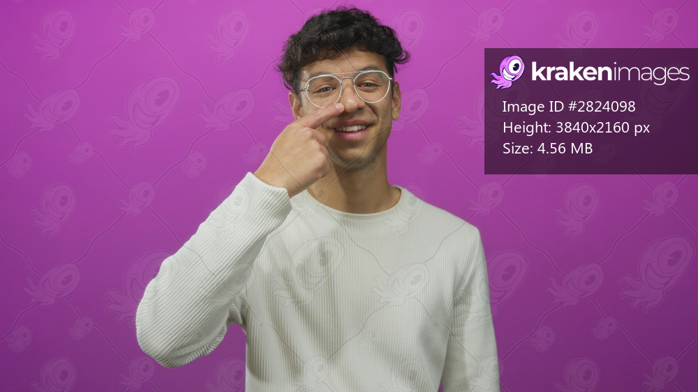 Man wearing white shirt and clear glasses smiling and pointing finger to nose in purple studio setting; playfulness.