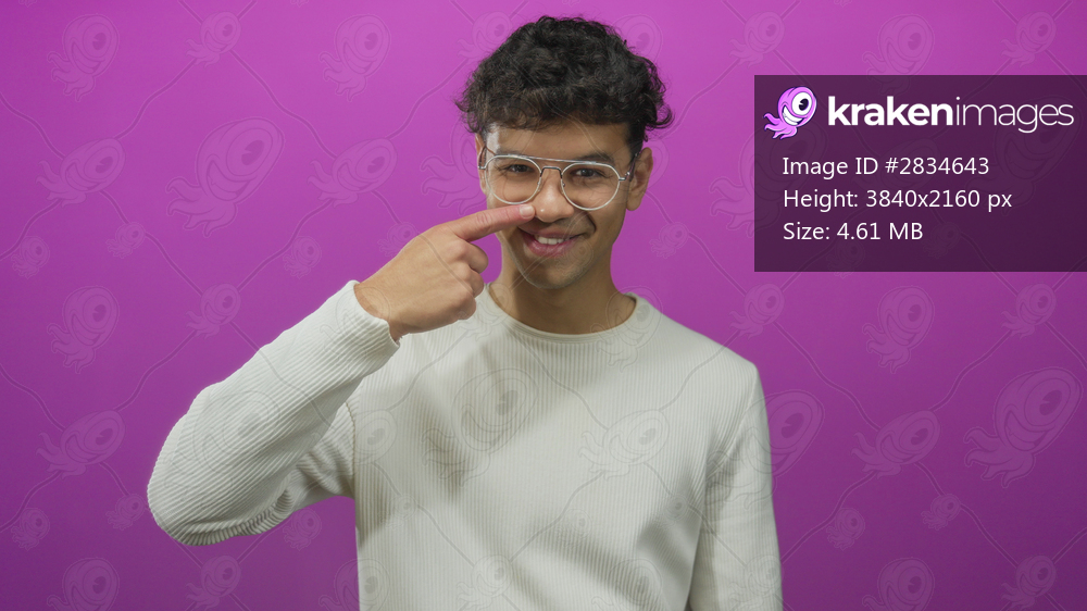 Man wearing white shirt and clear glasses smiling and pointing finger to nose in purple studio setting; playfulness.