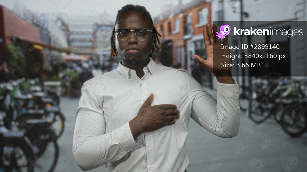 Man wearing white shirt and glasses with hand on chest and right hand raised in street with bicycles and brick buildings; pledge solemn.