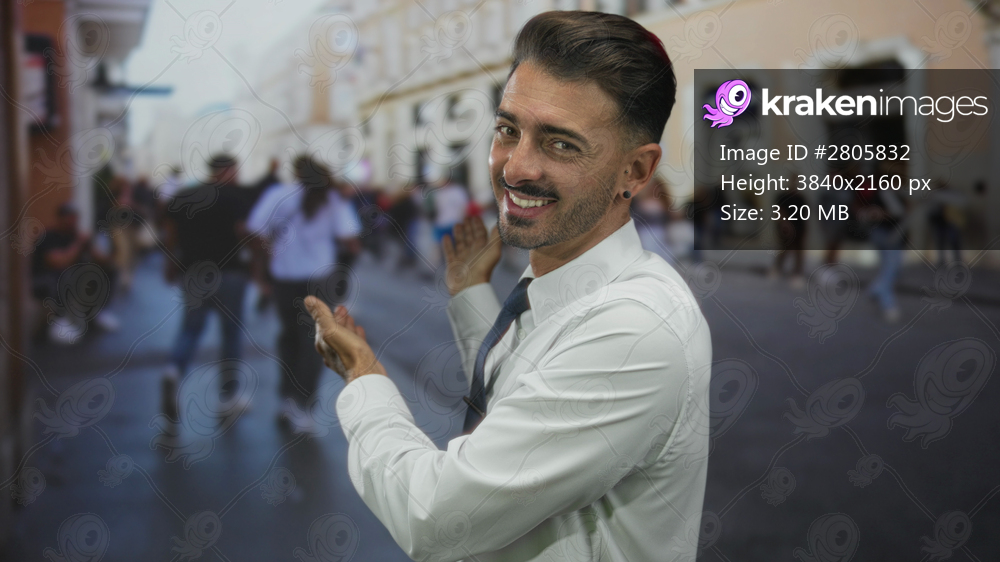 Man wearing white shirt and tie points hand toward vibrant city street with blurred pedestrians and buildings; welcome.