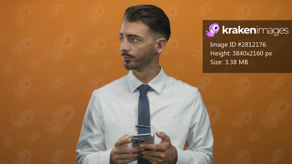 Man wearing white shirt and tie taps smartphone in orange studio; focus connectivity productivity innovation.