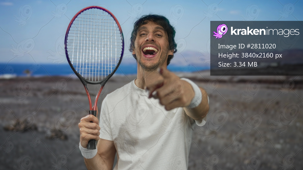 Man wearing white shirt and wristband holds tennis racket and points finger on street by rocky seaside shore; joy playfulness.