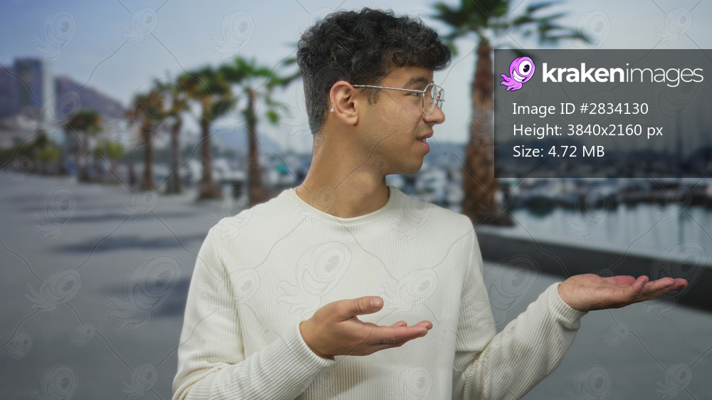Man wearing white sweater and glasses shows palms facing up beside boat on street promenade under palm trees; uncertainty.