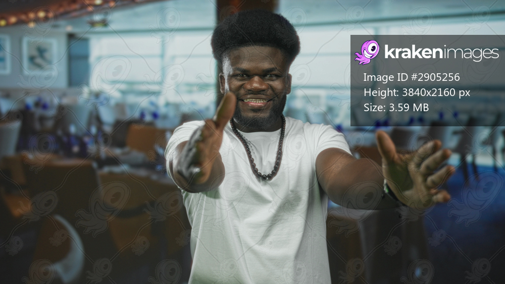 Man wearing white t shirt and beaded necklace with fists raised and hands clenched in a restaurant building dining room; joy celebration success.