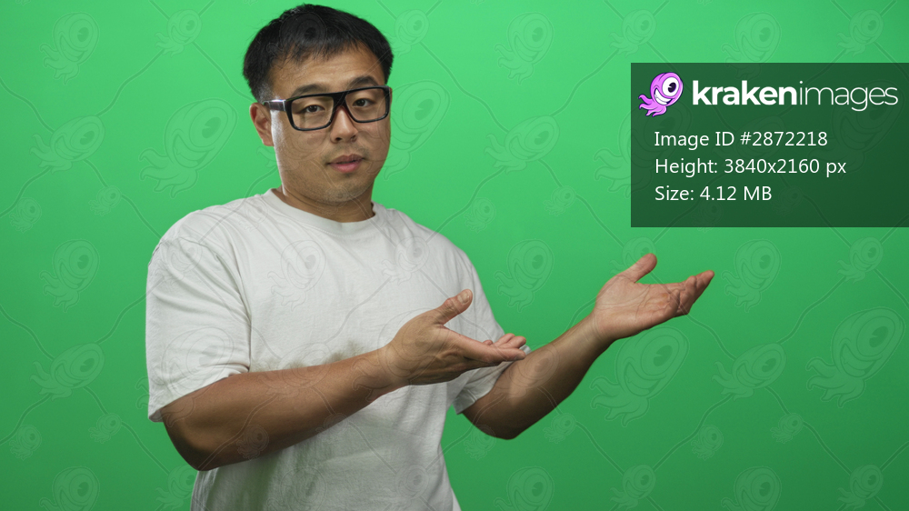 Man wearing white t-shirt and black glasses gestures with open hands in a green studio setting; confident presentation.