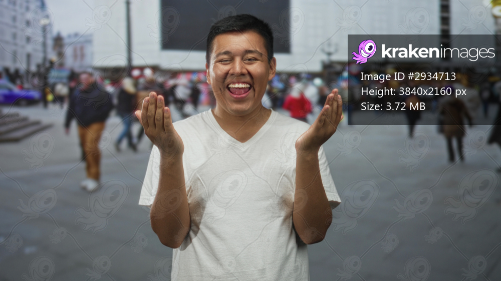 Man wearing white t shirt covering face with hands and smiling with closed eyes on a crowded street by a large building; amusement privacy.
