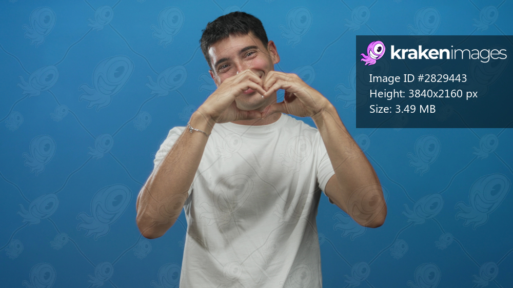 Man wearing white t shirt forms heart shape with hands and smiles in studio against blue backdrop; love.