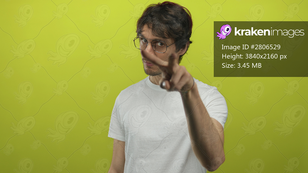 Man wearing white t shirt and glasses pointing finger directly at camera in bright green studio; confidence attention focus emphasis.