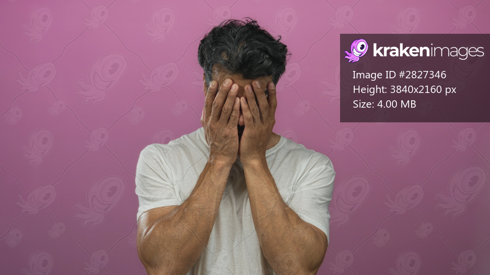 Man wearing white t shirt holding head between both hands and closing eyes in a studio with bright pink backdrop; frustration.
