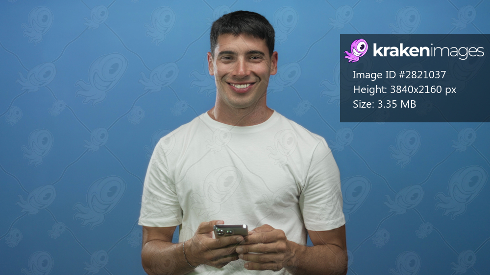 Man wearing white t shirt holding smartphone with both hands in studio against a blue wall; concentration.