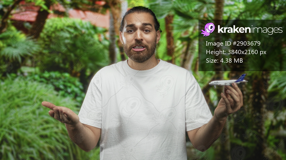Man wearing white t shirt holds a toy airplane model in his right hand and shrugs palms up in green forest; uncertainty travel choices.