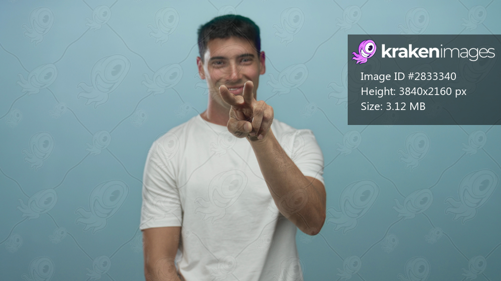 Man wearing white t shirt makes hand binoculars over eyes in a light blue studio; curiosity watching.
