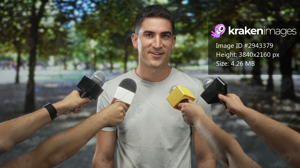 Man wearing white t shirt with microphones held by multiple hands on a tree lined street; press coverage confidence.