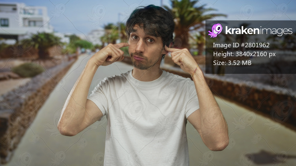 Man wearing white t shirt plugs ears with fingers on sunlit city street lined with palm trees; annoyance.