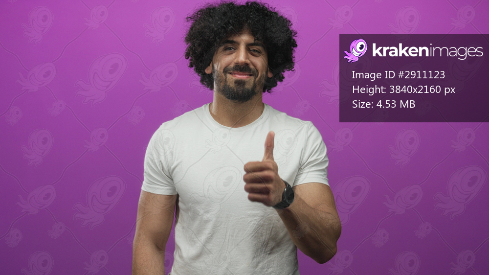 Man wearing white t shirt pointing finger with bare hand and watch in studio purple backdrop; confidence trust.