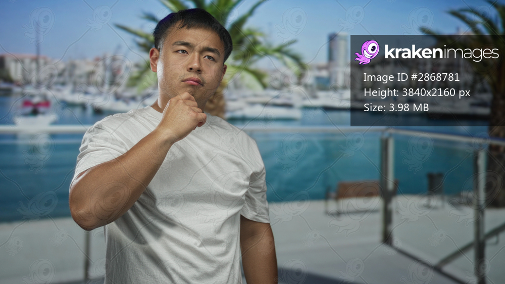 Man wearing white tshirt scratching head while standing alone at port marina by boats outdoors at seaside; confusion.