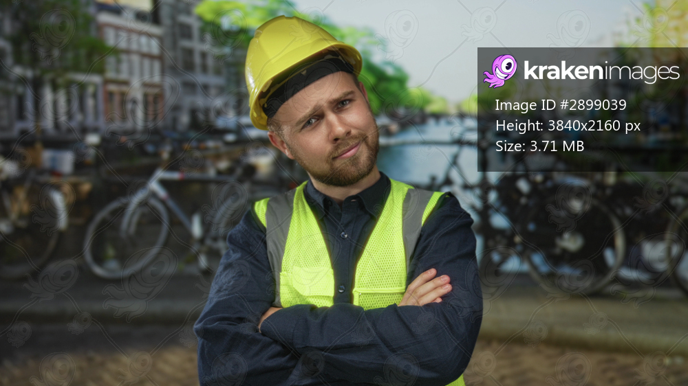 Man wearing yellow helmet and reflective vest posing with arms crossed on amsterdam canal street; quiet confidence.