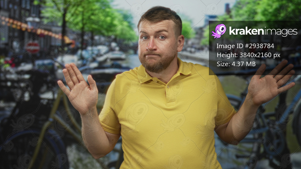 Man wearing yellow polo shrugging with palms up and hands visible beside parked bicycles along an amsterdam canal on street; uncertainty.