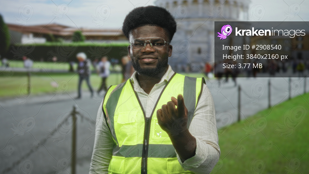 Man wearing yellow safety vest beckons with hand in front of building at pisa tower plaza while smiling at camera; safety guidance welcome.