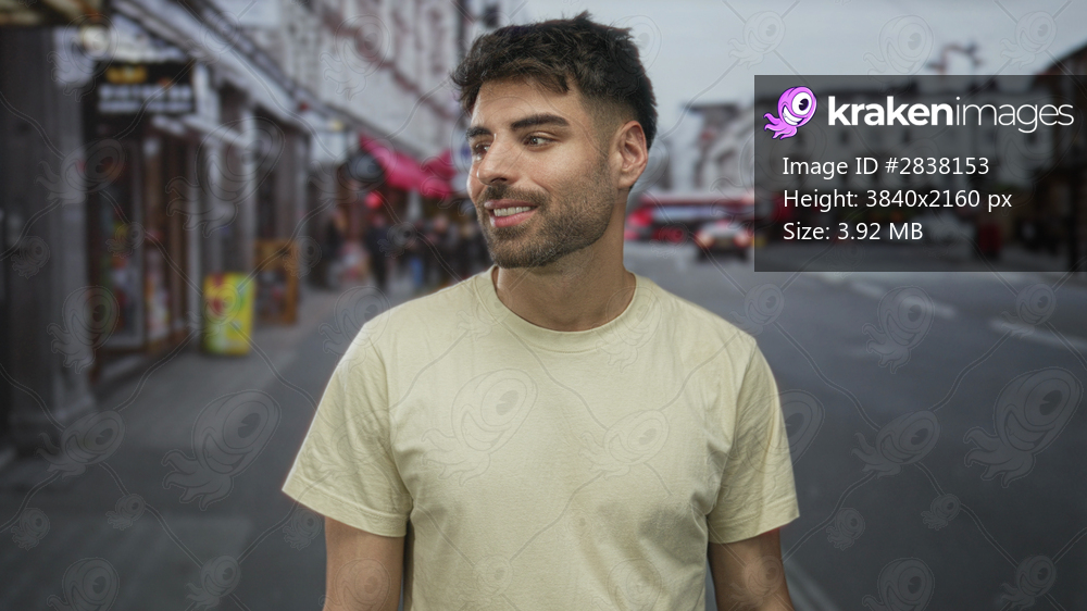 Man wearing yellow shirt smiles with bare face on busy city street at dusk in soft sunlight; happiness confidence ease growth.