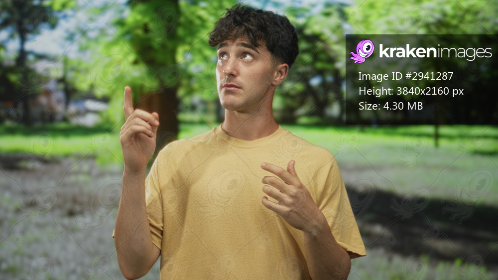 Man wearing yellow tee shirt points finger upward in forest park outdoors, hands visible and expressive; curiosity reflection.
