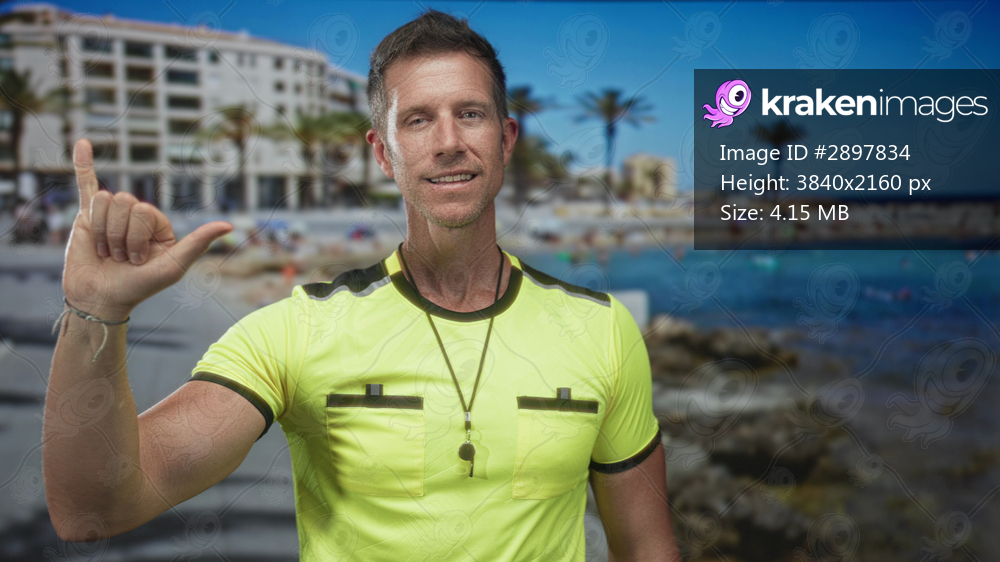 Man with whistle making l hand sign on street promenade by the seaside with closed eyes and smile; calm confidence.