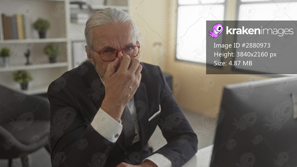 Man with white hair and red glasses in suit pinches bridge of nose at desk in office building while staring at monitor and briefcase; stress concentration. - Kraken Images